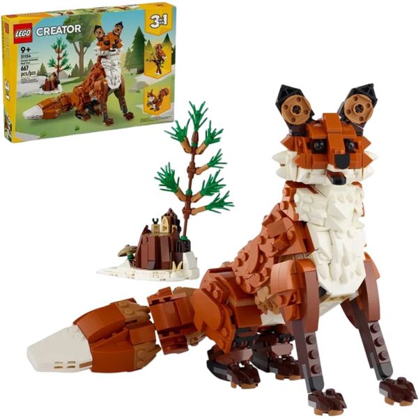 El LEGO Creator 3en1 Animales del Bosque: Zorro Rojo (31154) es un set de 667 piezas que permite a niños de 9 años en adelante crear tres animales distintos del bosque: un zorro rojo articulado, un búho y una ardilla. El zorro puede mover su cabeza, cuello, patas, boca, garras y cola, y se acompaña de una base con un tocón y un abeto nevados. El búho puede girar su cabeza 360 grados y se posa en una rama articulada midiendo 18 cm de altura, mientras que la ardilla incluye una bellota como accesorio. Con este set 3 en 1, los pequeños podrán construir, desmontar y reconstruir para vivir diferentes aventuras en el bosque, fomentando su creatividad y habilidades narrativas.