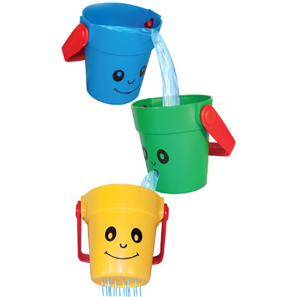 Los baldecitos Antex son ideales para aprender a realizar comparaciones entre las caídas de agua. Cada uno de los baldes tiene una característica especial, el verde saca el agua por la boca, el amarillo en forma de lluvia y el azul tiene pico.