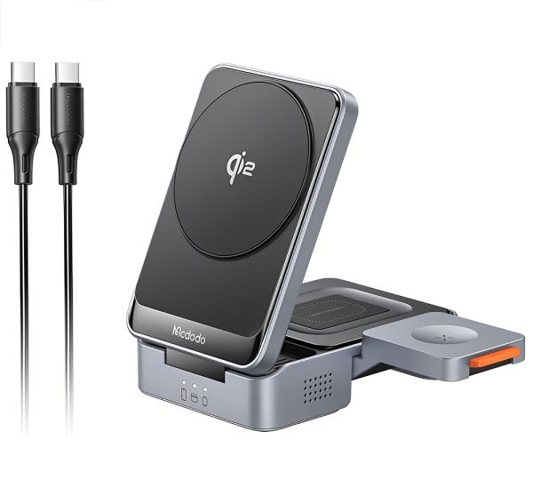 La Base de Carga Inalámbrica Plegable 3 en 1 Mcdodo CH-5193 MagQ Qi2 es una solución práctica y elegante para cargar hasta tres dispositivos al mismo tiempo. Con tecnología Qi2 para carga rápida y segura, diseño compacto y plegable ideal para viajes, y materiales resistentes como aluminio y ABS ignífugo, ofrece funcionalidad y estilo en un solo dispositivo. Incluye cable tipo C a tipo C, ahorra espacio y elimina el desorden de múltiples cargadores, siendo perfecta para el hogar, la oficina o llevar en movimiento.