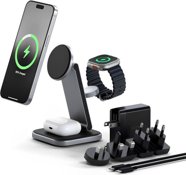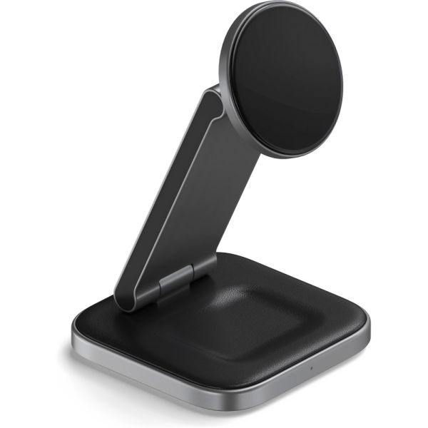 Mantén tus artículos esenciales de uso diario cargados y organizados con el soporte de carga inalámbrica Qi2 plegable 3 en 1 de Satechi. Impulsado por la última tecnología Qi2, puede entregar simultáneamente 15 W de potencia a tu iPhone, 5 W de potencia a tus AirPods y 5 W de potencia a tu Apple Watch. Su diseño plegable y apto para viajes cuenta con una carcasa de aluminio de primera calidad, una base de cuero vegano, un disco de carga de silicona suave y bisagras resistentes y duraderas que no se debilitarán con el tiempo, lo que permite una visualización óptima tanto en modo vertical como horizontal.