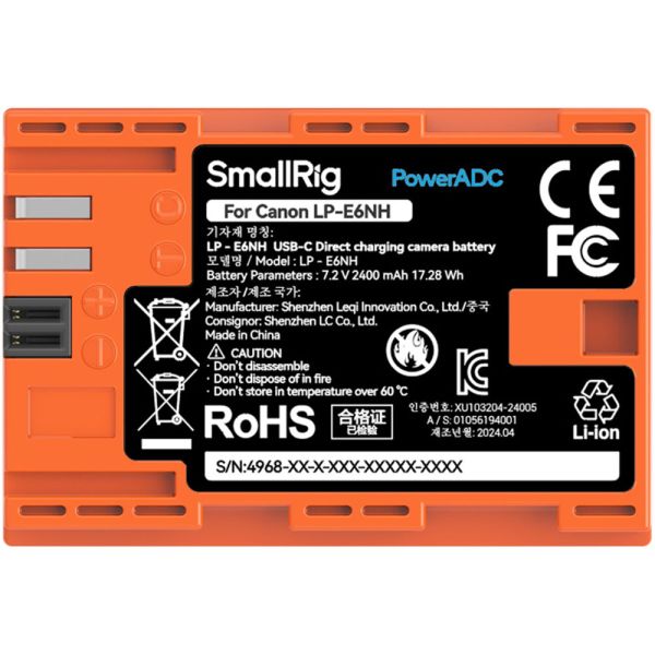 La batería USB-C LP-E6NH de SmallRig está diseñada para alimentar cámaras Canon compatibles con este modelo de batería. Con una capacidad de 2400 mAh y una potencia de 17.28 Wh, proporciona hasta tres horas de grabación de video o hasta 780 fotos con una sola carga. Su puerto USB-C integrado y el cable incluido permiten una carga rápida y conveniente desde cualquier fuente compatible, eliminando la necesidad de un cargador dedicado. Fabricada con tecnología de iones de litio, garantiza un rendimiento estable en un rango de temperatura de 0 a 45 °C, ideal para diversas condiciones de uso.