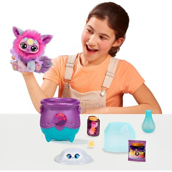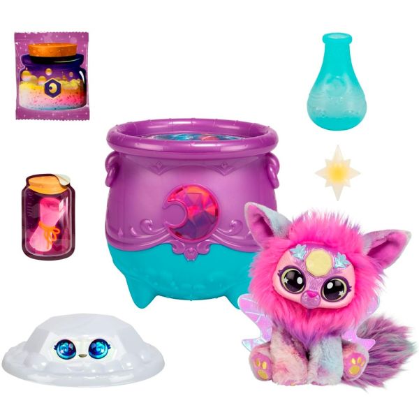 El Caldero Sorpresa Moose Toys Magic Mixies Magical Gem Surprise - Moon ofrece una experiencia mágica e interactiva para niños a partir de 5 años. Este set incluye un caldero mágico que, al agregar agua y decir el hechizo, burbujea y revela una figura de peluche Mixie con una gema lunar en su frente. El Mixie se ilumina al presionar la gema, creando un efecto brillante. Además, el set contiene un anillo mágico que cambia de color y brilla en la oscuridad, añadiendo un toque especial a la experiencia. Los niños pueden sumergirse en el mundo del Shimmerverse y disfrutar de una experiencia sensorial y creativa. Este juguete fomenta la imaginación y el juego simbólico, siendo ideal para regalar y compartir momentos mágicos.Contiene