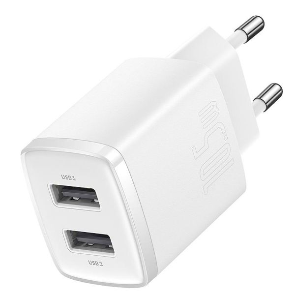 Características:Adaptador de corriente Baseus Compact de alta calidad con enchufe de la UEGran potencia de salida de 10,5 W para una carga rápida de sus dispositivosDoble puerto USB para la carga simultánea de dos dispositivosEquipado con seis capas de protección para una carga seguraEste cargador de pared es compatible con todos los dispositivos habilitados para USBEl pequeño y el diseño compacto del cargador ocupa un espacio mínimo.