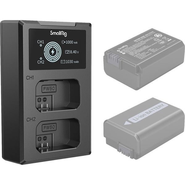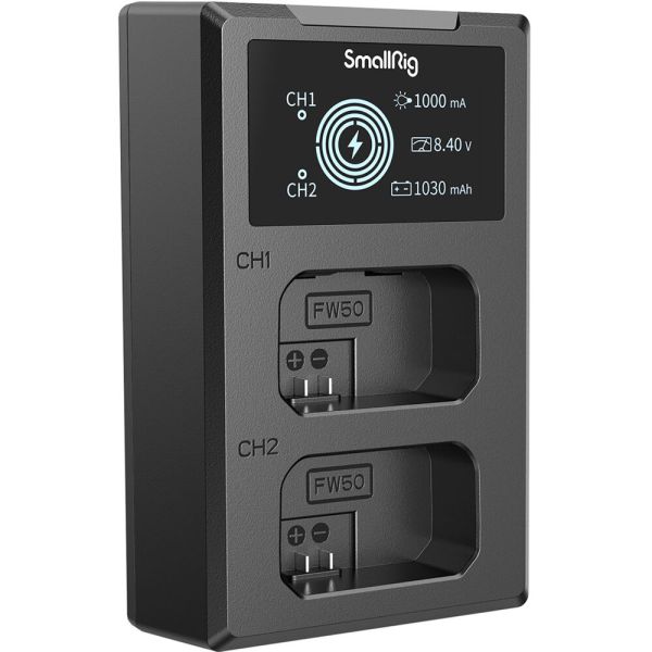 El cargador de batería SmallRig NP-FW50 4081 es la solución perfecta para mantener tus baterías siempre cargadas. Fabricado con material ignífugo ABS+PC de alta calidad, su superficie mate es resistente a altas temperaturas, brindando durabilidad. El compartimento de batería incorporado se ajusta sin problemas al tamaño de la batería original de tu cámara. Con su diseño de doble ranura, podrás cargar dos baterías simultáneamente. La pantalla LCD muestra en tiempo real el voltaje, la corriente y la cantidad de carga, brindando información intuitiva. Además, el cargador cuenta con un cable de carga USB-A incorporado y un puerto USB-C, permitiendo diversas opciones de carga a través del cargador, el cargador de auto o un cargador portátil. Mantén tus baterías siempre listas con el cargador de batería SmallRig NP-FW50 4081.