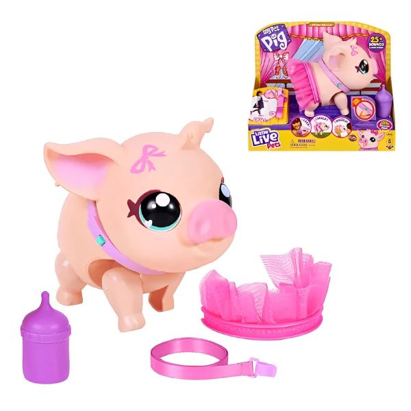 ¡A Piggi Bella le encanta el ballet y se ve hermosa con su tutú brillante y su moño! Con más de 25 sonidos y reacciones, Piggi Bella se mueve y suena como un cerdito real. Dale de comer con su biberón y abrázala mientras reacciona a tu tacto. Levántala y toca tu nariz con su hocico y te dará un dulce beso. Piggy hace muchos sonidos divertidos y dulces: gruñe, se alimenta, se ríe, eructa, huele, estornuda e incluso puede soltar un lindo pedo. Piggi Bella tiene una piel súper suave y orejas caídas que se mueven cuando se mueve. Pasea con ella con su correa o mira cómo se mueve y baila con sus propias melodías musicales. Piggi Bella viene con una correa para caminar desmontable, un biberón, un folleto de instrucciones y se incluyen pilas para que esté lista para jugar contigo.