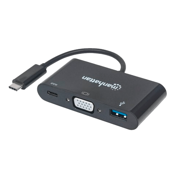 Conecta fácilmente un dispositivo USB Tipo-C con una pantalla VGA y periféricos USB El VGA Docking Convertidor USB Tipo-C de Manhattan establece una rápida, simple y cómoda conexión entre fuentes de medios recientes y equipados con USB Tipo-C (computadoras-tablets, etc.) y pantallas VGA existentes (monitores, proyectores, etc.) tanto en modo de Pantallas Duplicadad o Extendidas.