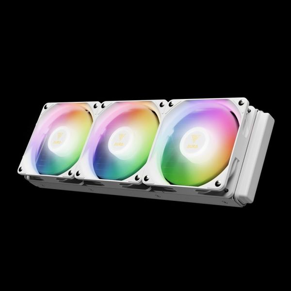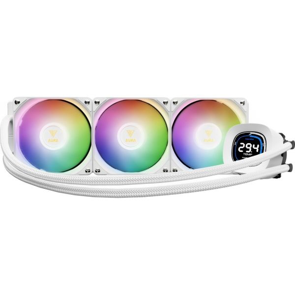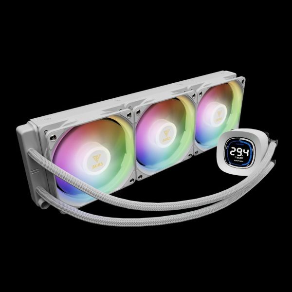 El Cooler Líquido Gamdias Aura GL360 Digital ARGB para CPU combina rendimiento térmico avanzado con un diseño moderno e inteligente. Incorpora una pantalla digital de 2.1" que muestra en tiempo real datos clave del sistema, brindando un monitoreo visual preciso y elegante. Su sistema optimizado de circulación de líquido, junto con una base de cobre mejorada y tubos EPDM con funda, garantiza una transferencia térmica eficiente y durabilidad superior.Equipa tres ventiladores hidráulicos PWM de 120 x 120 x 25 mm, con una velocidad ajustable de 800 a 1800 RPM ±10%, generando un flujo de aire de hasta 73.71 CFM con solo 33 dBA de ruido. El radiador de aluminio de 396 x 120 x 27 mm disipa el calor de manera eficaz, ideal para sistemas exigentes.Gracias a su iluminación ARGB compatible con placas base mediante conector digital de 5V (3 pines), podrás sincronizar efectos visuales con el resto de tu setup. Es compatible con una amplia gama de sockets, incluyendo Intel LGA 20XX, 1851, 1700, 1200, 115x y AMD AM5, AM4 y AM3. La instalación es sencilla con los kits de montaje universales incluidos, haciendo del Gamdias Aura GL360 una solución premium tanto en estética como en refrigeración de alto nivel.