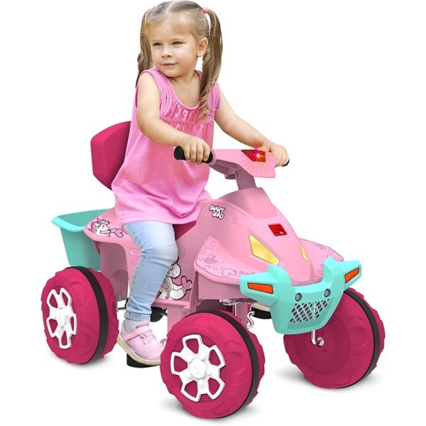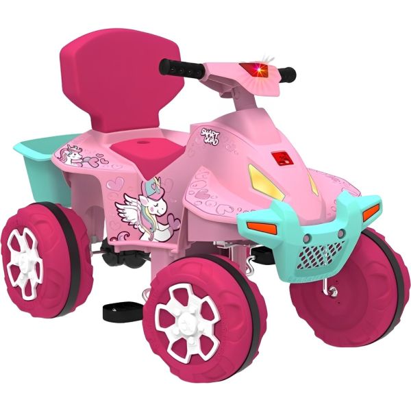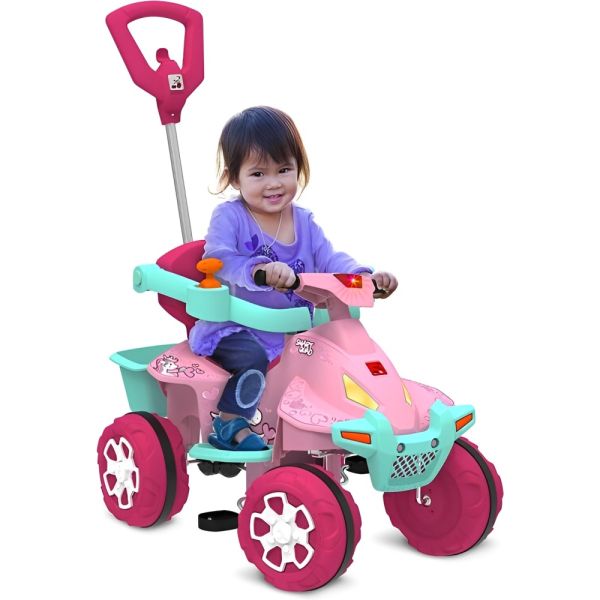El cuadriciclo infantil Bandeirante Smart Quada Pedal es el compañero perfecto para los más pequeños en sus aventuras al aire libre. Diseñado por la reconocida marca Bandeirante, este cuadriciclo es ideal para niños a partir de 12 meses, soportando un peso máximo de 35 kg, asegurando diversión y seguridad. Con su atractivo color rosa, este vehículo infantil cuenta con un manillar equipado con visor, luz LED y un soporte para botellas de agua o biberones, facilitando la hidratación en el paseo. El respaldo anatómico proporciona un soporte cómodo para los niños, mientras que la varilla orientable y desmontable permite a los padres mantener el control con facilidad. Su sistema de tracción innovador con cardan ofrece una experiencia de pedaleo suave y ágil. Las ruedas con anillos de protección y los reposapiés extraíbles garantizan estabilidad y confort. Además, incorpora un práctico baúl debajo del asiento para guardar objetos esenciales. La seguridad está reforzada con una valla protectora desmontable con apertura lateral. Este cuadriciclo no solo es un juguete, sino una herramienta para el desarrollo motriz y la diversión de los pequeños aventureros.