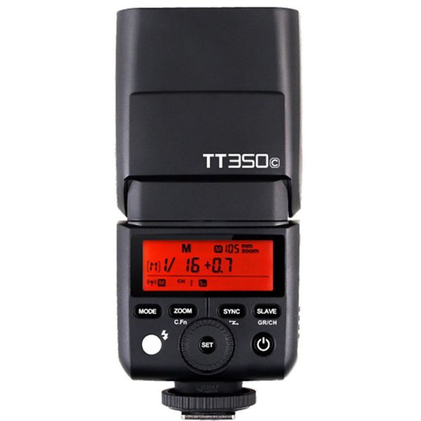 El flash Godox TT350 posee un sistema integrado de 2.4GHz para facilitar la creación de iluminación simple y elaborados. Cuenta con un diseño liviano y un número de guía de 118' a ISO 100 y 105mm, es útil tanto para operaciones dentro como fuera de la cámara. También cuenta con un cabezal de zoom con un rango de 24-105mm y puede inclinarse de -7 a 90° y girar 270°. Permite una configuración simple como un esclavo óptico además de usarlo como una unidad maestra/esclava de radio TTL. Además, posee una pantalla LCD trasero que muestra la configuración y funciona con cuatro pilas AA, que ayudan a proporcionar un tiempo de reciclaje de 0.1 a 2.2 segundos.