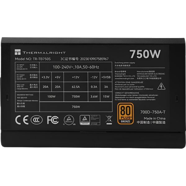 La Fuente de Alimentación Thermalright 80 Plus Bronze 750W es la solución ideal para entusiastas de los videojuegos y profesionales que requieren un rendimiento excepcional y confiabilidad en sus sistemas de escritorio. Con un diseño en negro elegante y una estructura ATX, esta fuente de alimentación está diseñada para adaptarse a la mayoría de los gabinetes estándar, garantizando un ajuste perfecto y una instalación sin complicaciones. Su potencia de 750 W es más que suficiente para alimentar equipos de alto rendimiento, incluidos aquellos que integran múltiples componentes de alto consumo energético como tarjetas gráficas avanzadas y múltiples discos duros. La certificación 80 Plus Bronze asegura una eficiencia energética del 80%, lo que se traduce en un menor consumo de energía y menos calor generado, optimizando así el rendimiento general del sistema. Equipada con conectores SATA y un conector de interfaz 20+4 pines, esta fuente es compatible con una amplia gama de configuraciones de hardware. La Thermalright TR-TB750S incluye un sistema de PFC activo para mejorar la entrega de energía y reducir el ruido eléctrico, asegurando una experiencia de usuario más estable y silenciosa. Esta fuente es perfecta para quienes buscan calidad superior y estabilidad robusta sin comprometer el rendimiento de sus PCs de escritorio o servidores personales.