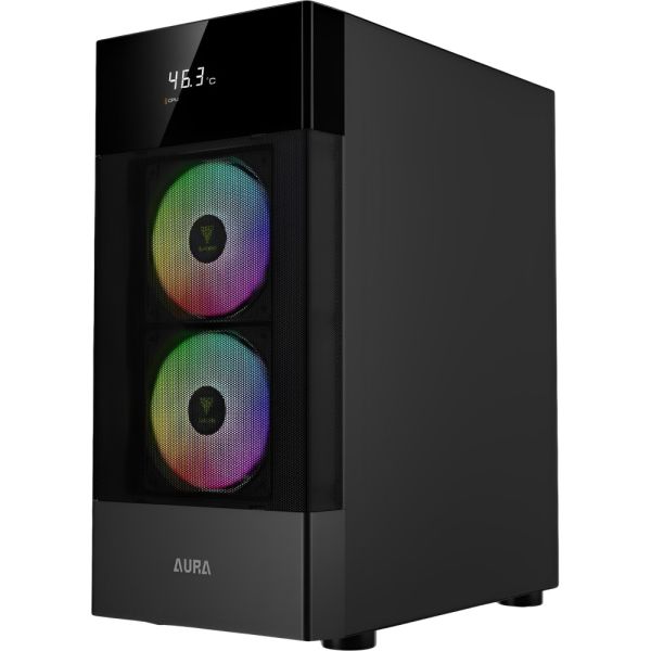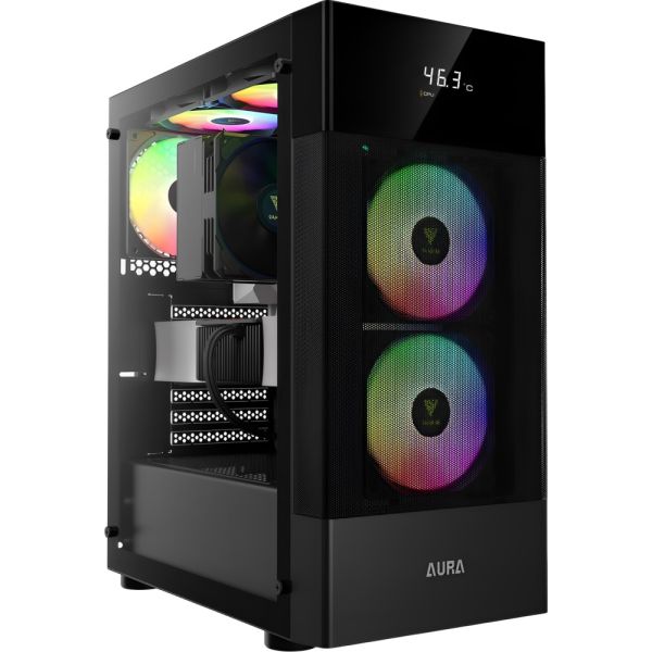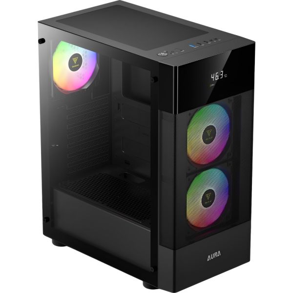 La AURA GC5 combina diseño funcional, estética llamativa y un precio asequible, ofreciendo un gabinete de torre media compacto ideal para configuraciones de gaming o trabajo. Su pantalla digital integrada y los ventiladores RGB fijos preinstalados la convierten en una excelente opción para usuarios que buscan monitoreo en tiempo real y un flujo de aire eficiente.Especificaciones: