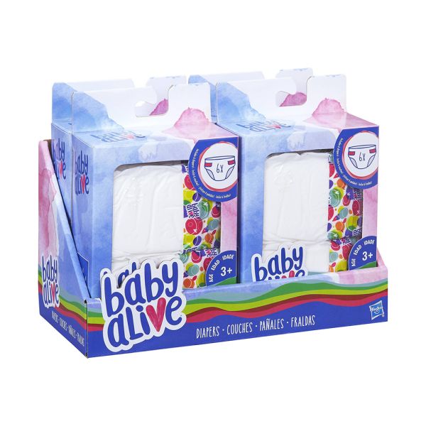 Este paquete incluye 24 pañales que se adaptan a las muñecas Baby Alive que hacen "pipí y popó". Los niños pueden cambiar a sus muñecas con un pañal limpio y fresco, como lo haría una mamá o un papá de verdad.