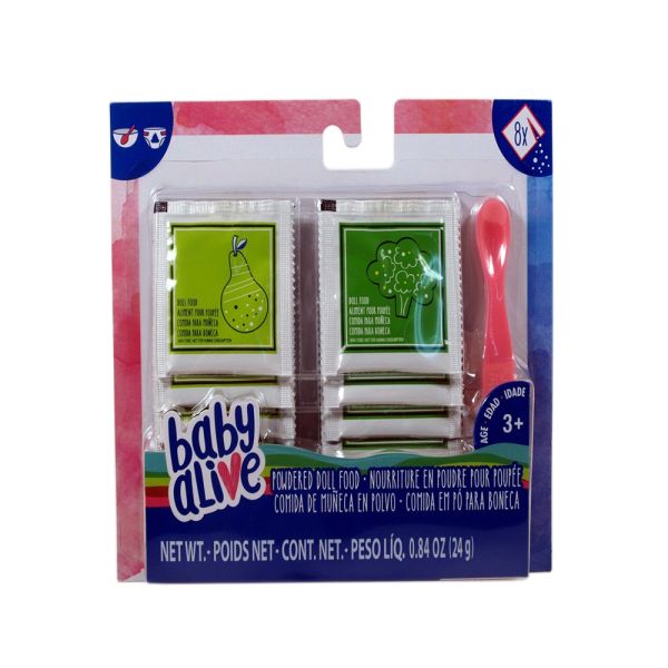 El paquete de recarga de comida en polvo para muñecas Hasbro es ideal para Baby Alive. Contiene 8 paquetes de comida y una cuchara.