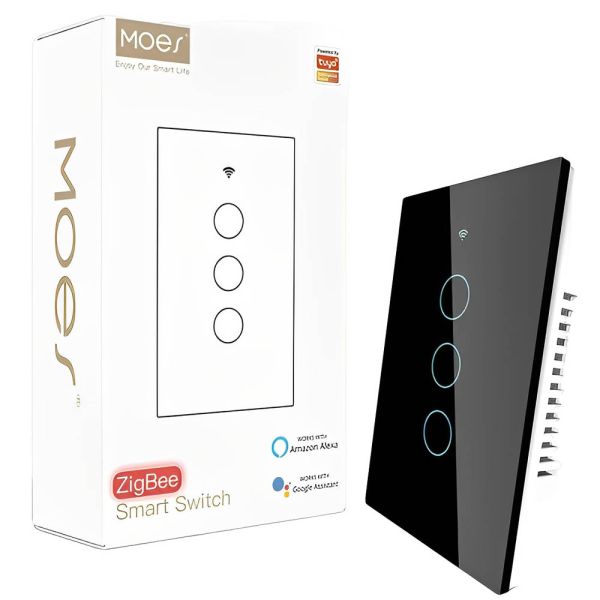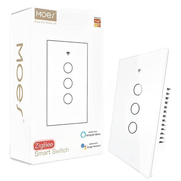 Actualice su hogar con el interruptor de luz inteligente Touch Moes Zigbee ZS-US3-LN 3 botones Wifi, una solución avanzada para maximizar el confort y la eficiencia en su espacio. Este interruptor inteligente es un componente esencial para cualquier sistema de hogar inteligente moderno. Requiere un cable neutro y soporta cargas de hasta 2200 W a 220v y 1100 W a 110v gracias a su robusto esquema de relé de 10 A. Fabricado con delicado vidrio templado y material de PC, es fácil de limpiar y ofrece resistencia a la humedad, lo que lo hace ideal para múltiples entornos. Compatible con la red en malla ZigBee, amplía el alcance de su puerta de enlace ZigBee (se requiere una para su funcionamiento). Perfecto para cualquier configuración de hogar, este interruptor no solo proporciona funcionalidad sino que también aporta un toque moderno y elegante a sus habitaciones. Ideal para quienes buscan integrar tecnología de punta en su hogar sin sacrificar el estilo, este interruptor asegura un manejo eficiente de la iluminación en cualquier habitación. Mejore su hogar inteligente hoy con Moes. El interruptor de luz inteligente ZigBee también funciona como relé y es compatible con la red en malla ZigBee para ampliar el alcance de su puerta de enlace. Tenga en cuenta que se requiere una puerta de enlace ZigBee para su funcionamiento. Mejore la configuración de su hogar inteligente con este interruptor confiable y elegante, diseñado para combinarse a la perfección con cualquier decoración.