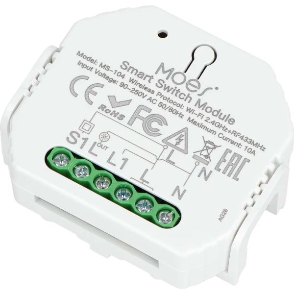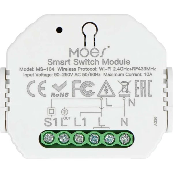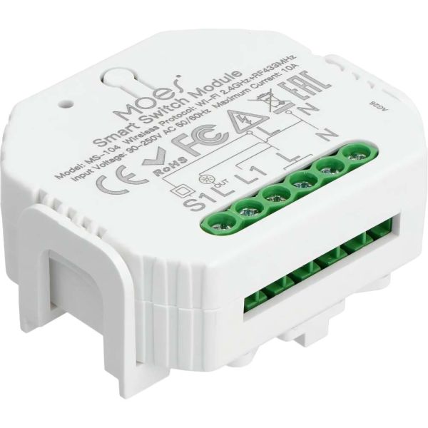 El interruptor inteligente Moes MS-104 1 Gang Wi-Fi RF está diseñado para montarse debajo de un enchufe o dentro de la caja de un interruptor de luz. Este interruptor inteligente te permite controlar de forma remota un interruptor de luz mediante la aplicación Smart Life (Android, iOS).