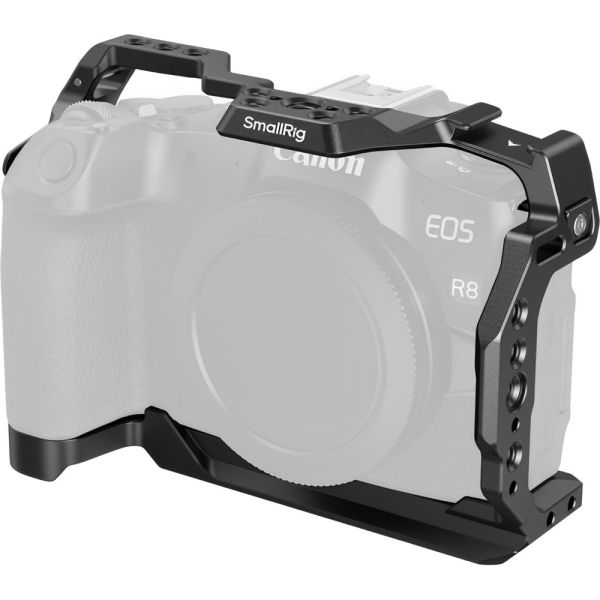 La jaula para cámara SmallRig 4212, diseñada específicamente para la Canon EOS R8, ofrece una estructura protectora de aluminio que permite montar múltiples accesorios sin obstruir el acceso a los controles de la cámara. Su diseño incluye una zapata fría, un riel NATO, un conector QD, ranuras para correas y múltiples roscas para accesorios de 1/4"-20, 3/8"-16 y estilo ARRI en la parte superior y los laterales. El montaje antitorsión de 3 puntos, junto con un tornillo de montaje de 1/4"-20 y almohadillas de silicona, asegura la cámara y la protege de arañazos.