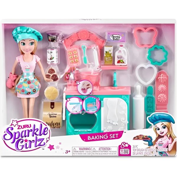 ¡Conoce a la Panadera Sparkle Girl! Usa este enorme set de 25 piezas para ayudarla a hacer deliciosos productos horneados. Abre y cierra las puertas del horno, saca la bandeja, mezcla y amasa tus ingredientes para horas de diversión. La muñeca Sparkle Girlz tiene características detalladas y hermosas, cabello real y un conjunto de panadera totalmente removible que incluye un delantal y un gorro, los cuales son intercambiables con otras muñecas Sparkle Girlz.