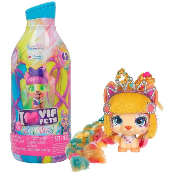 El juguete Mascota Vip Pets Color Boost con accesorios viene en una botella de champú cubierta por una cortina iridiscente. Las niñas deberán girar el tapón de su champú y, poco a poco, la cortina brillante desaparecerá, revelando el personaje sorpresa. Además, permite añadir un toque de color al pelo de la mascota, que mide 30 cm de longitud, para crear estilos ilimitados; aportando así una dimensión mágica y creativa a la experiencia de juego.
