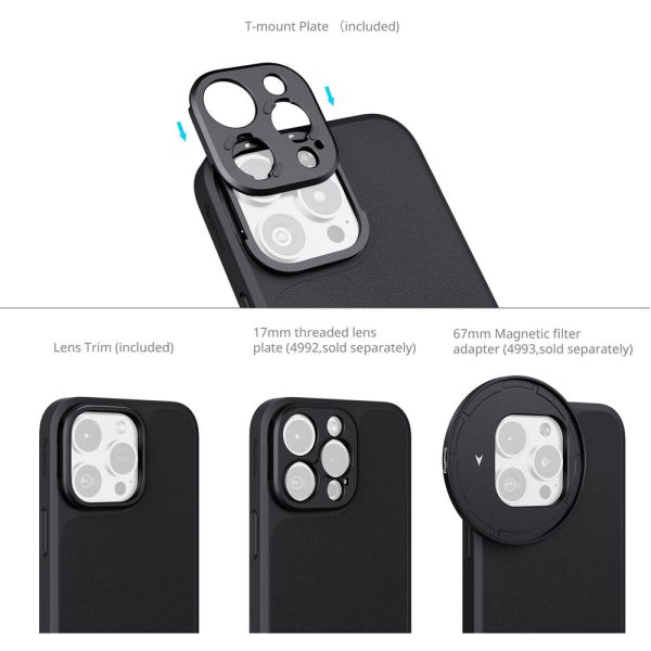 El Kit de Estuche SmallRig 4988 para iPhone 16 Pro está diseñado para mejorar tu experiencia fotográfica con un enfoque elegante y funcional. Este kit incluye una funda para iPhone 16 Pro Max, una empuñadura de captura, una placa trasera para lente con montura en T y un anillo de ajuste para lente. La funda no solo protege tu teléfono, sino que incorpora un imán N52 compatible con la carga MagSafe, tanto con cable como de forma inalámbrica, y es compatible con accesorios adicionales. Además, puede usarse como funda independiente.El diseño de la empuñadura ofrece una mejor respuesta táctil y un control preciso del botón de captura, mientras que la montura roscada de 1/4"-20 en la parte inferior permite utilizarla con un trípode, monópode u otros dispositivos compatibles. La placa trasera para lentes con montura T es intercambiable por una placa roscada de 17 mm o un adaptador de filtro de 67 mm, disponibles por separado. Además, cuenta con un orificio para cordón que permite colocar una correa de muñeca o accesorio para evitar caídas accidentales. Fabricado con materiales de alta calidad como TPU, PC, cuero y aleación de aluminio, este kit no solo es funcional, sino también resistente y elegante.
