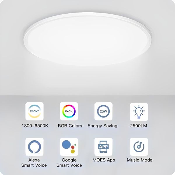 La Lámpara Inteligente de Techo Moes WCL-TD25-RCW-Y-WH Wifi en color blanco es la elección perfecta para modernizar la iluminación de su hogar. Diseñada para ofrecer máxima eficiencia y adaptabilidad, esta lámpara LED regulable de 25 W transforma cualquier espacio con una luz suave y eficiente, alcanzando un ángulo luminoso de 120 grados que garantiza una cobertura completa y uniforme. Gracias a su conectividad WiFi, puede controlar la iluminación de su hogar sin esfuerzo utilizando solo su voz. Compatible con los populares asistentes de voz como Google Assistant, Alexa y la aplicación TUYA Smart, ofrece una experiencia de usuario superior, donde la innovación y la comodidad se unen. Instale la Lámpara Inteligente de Techo Moes en cualquier habitación para una iluminación personalizada, ya sea en la sala de estar, el dormitorio o la cocina. Sus características inteligentes le permiten ajustar la intensidad de la luz para adaptarse a diversas ocasiones, desde una reunión familiar hasta un momento de relajación. Actualice su espacio con este producto que combina estilo contemporáneo y tecnología avanzada para una vida más inteligente y eficiente.