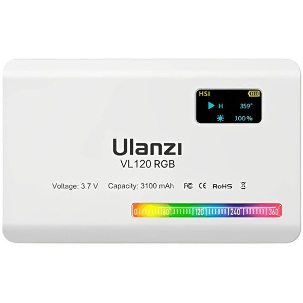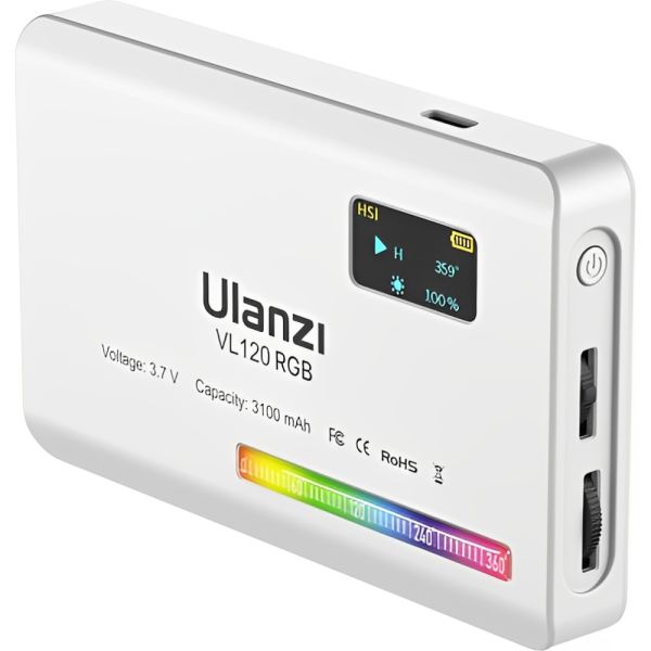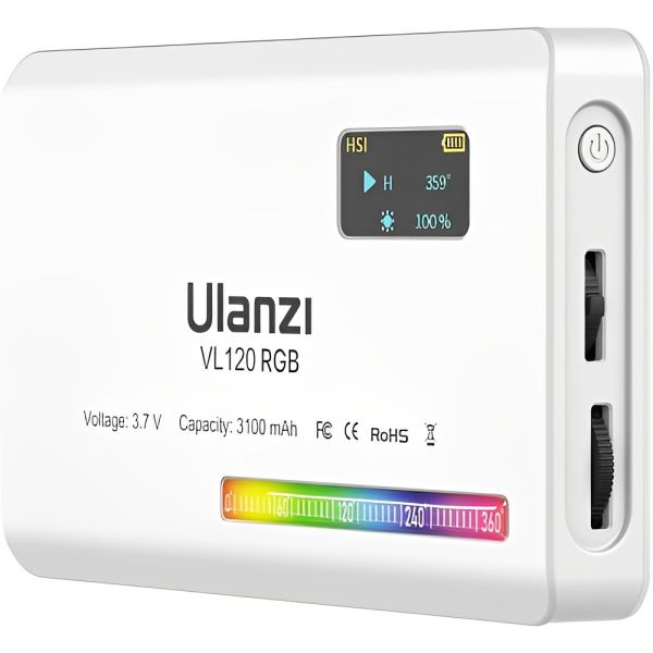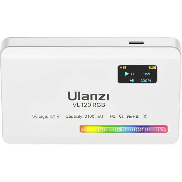 Luz de video LED Ulanzi VL120 RGB tiene un diseño compacto que presenta selección de color RGB, una temperatura de color variable de 2500 a 9000 K, atenuación de 0 a 100 % y 20 efectos de iluminación. Su diseño compacto y ligero te permite llevarla fácilmente en el bolsillo, y la batería integrada de 3100 mAh se carga por completo en aproximadamente 2,5 horas mediante el cable USB tipo C incluido. La luz LED también cuenta con una pantalla OLED, así como una rosca de montaje de 1/4"-20 y un adaptador de zapata fría para montar en tu cámara o equipo. La luz de fotografía Ulanzi VL120 RGB tiene brillo máximo de 1250 LUX (1.0 ft), proporciona buenas condiciones fotográficas para satisfacer tus necesidades de disparo de luz oscura. La batería de litio integrada de 3100 mAh, puede lograr hasta 3 horas de iluminación continua. Carga tipo C, también se puede utilizar mientras se carga.