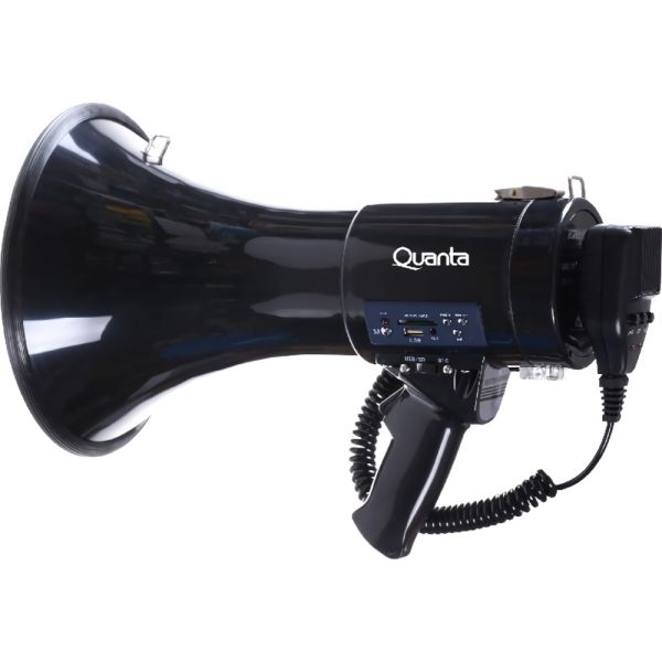 El megáfono Quanta QTMER250 250 W cuenta con un diseño compacto y resistente, ideal para conferencias, escuelas, conciertos o eventos al aire libre, ya que viene con batería recargable, función de sirena y grabador de voz. Dispone de puertos USB, SD y MMC para mayor versatilidad.