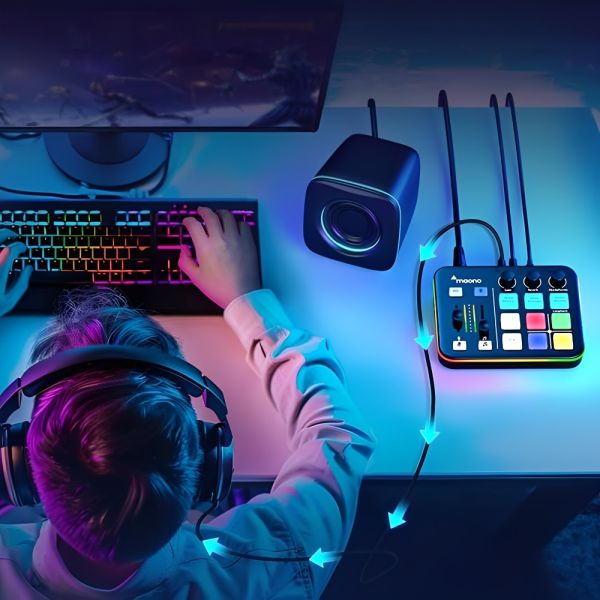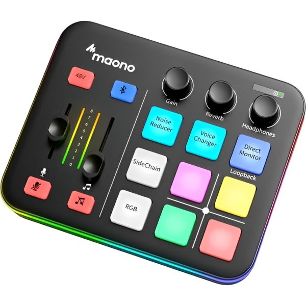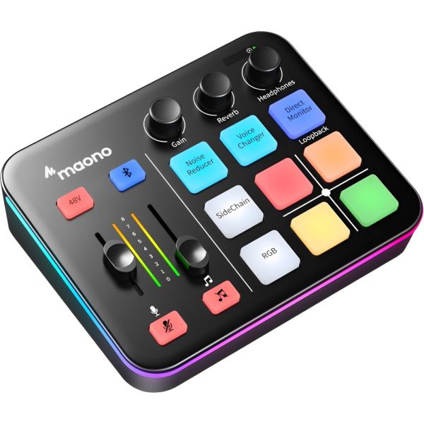 El Mezclador de Audio Maono G1 Neo RGB es la herramienta definitiva para cualquier creador de contenido que busque calidad y control total sobre sus transmisiones. Este dispositivo ofrece un sonido de audio de primera categoría gracias a su preamplificador Pro integrado y la alimentación fantasma de 48V, optimizando el rendimiento de cualquier micrófono XLR. Con un control preciso de ganancia y volumen, garantiza que tu voz se escuche clara y potente. Ideal para streamers y podcasters, este mezclador facilita la transmisión mediante funciones de silenciamiento de música y micrófono con un solo clic, asegurando un audio limpio y profesional. La reducción de ruido de dos niveles y la conexión Bluetooth 4.2 mejoran significativamente la calidad de las transmisiones en vivo. El Maono G1 Neo también ofrece una experiencia de usuario intuitiva con su control de monitoreo directo y efectos de sonido personalizados, como cambios de voz y pads de sonido únicos. Su iluminación RGB con 11 variaciones de color añade un toque visual impresionante, ideal para personalizar tu espacio de juego. Compatible con una amplia gama de dispositivos y plataformas como OBS Studio, Discord, y más, este mezclador es perfecto para quienes buscan destacar en Twitch, YouTube y otras plataformas de streaming.