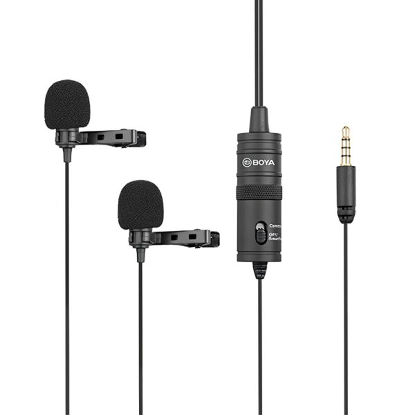 El micrófono Lavalier omnidireccional dual Boya BY-M1DM cuenta con dos micrófonos lavalier conectados a un único conector TRRS de 3.5mm, lo que facilita la grabación de dos personas al mismo tiempo en su teléfono inteligente, cámara DSLR/sin espejo, videocámara, grabadora, computadora o similar. dispositivo. Ideal para entrevistas, diálogos, podcasting, transmisión en vivo y cualquier situación que requiera dos parlantes.Características:Diseño de micrófono dual para dos parlantes.Trabajar con cámaras, teléfonos inteligentes y computadoras.Ideal para entrevistas, diálogos, podcasting y transmisión en vivo, etc.Patrón polar omnidireccional.Relación señal/ruido mejorada.Con cable de 4m(13') de longitud.Incluye parabrisas de espuma, clip de solapa, adaptador de 1/4” y batería LR44.