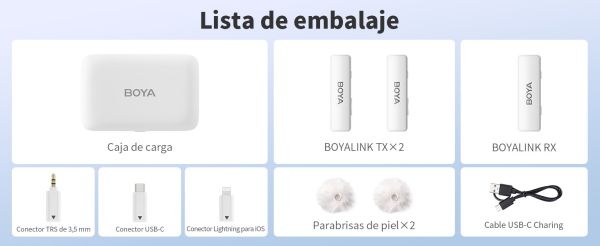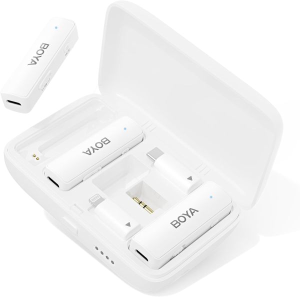 Micrófonos inalámbricos blancos: el micrófono Lavalier inalámbrico BOYALINK-W viene con un estuche de carga blanco y tres adaptadores (USB Tipo-C, Jack de 3,5 mm, Lightning). Es adecuado para cámaras réflex digitales, videocámaras, grabadoras de audio, dispositivos USB-C y dispositivos iOS, teléfonos inteligentes, tabletas, ordenadores portátiles, iPad, PC, etc. Ideal para grabación de vídeo y audio, vlogging, YouTube, Facebook, entrevistas.