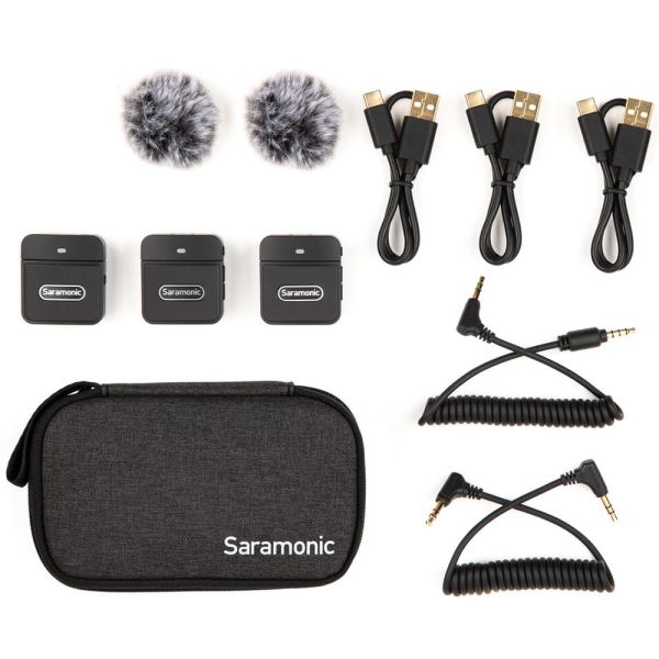 Incluye: 2 transmisores, 1 receptor, 2 cables 3.5 mm, 3 cables USB-C, 2 fur windshield y 1 bolsa transporte