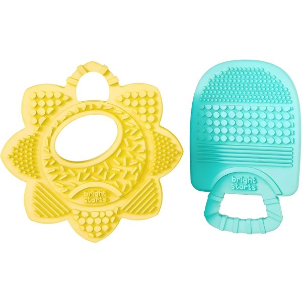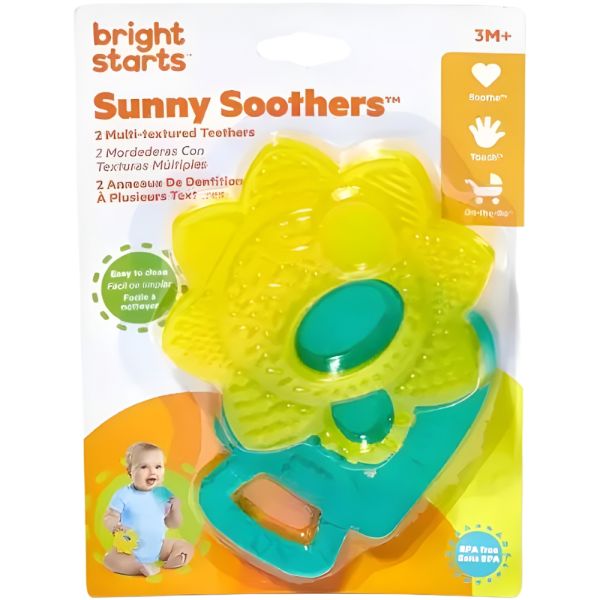 Mordedores Bright Starts Sunny Soothers, juego de 2 piezas, destacan por su diseño divertido y colorido, confeccionados en plástico de alta calidad. Están especialmente diseñados para calmar las encías adoloridas de bebés a partir de 3 meses. Estos mordedores cuentan con un innovador diseño adherente que facilita su uso. Su textura única no solo proporciona alivio calmante, sino que también masajea suavemente las encías del bebé durante el proceso de dentición. Fabricados con material libre de BPA, garantizan una dentición segura para el pequeño. La forma fácil de agarrar y el diseño de cerdas múltiples en forma de sol y paletas ofrecen un doble beneficio para calmar el dolor de encías. Este pack brinda la conveniencia de contar con dos mordedores para mayor comodidad. Descubre la dulzura de aliviar el dolor de encías con estos chupetes de textura múltiple, una solución eficaz y segura para acompañar a tu bebé durante el proceso de dentición.