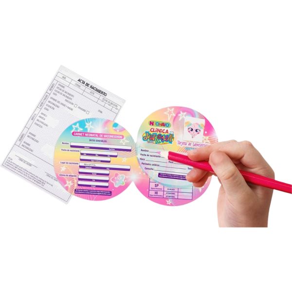 Set de juguetes para estimular la imaginación y creatividad. El set de 13 piezas incluye 1 muñeco, 1 pañal, 2 moños, 1 cordón umbilical, 1 sorpresa, 1 chupón, 1 toalla, 1 acta de nacimiento, 1 foto, 1 cartilla de vacunación, 1 credencial de cunero y 1 instructivo de juego. Además, podría incluir un personaje extra, que viene oculto aleatoriamente en algunos empaques. ¡Con suerte, te tocará!
