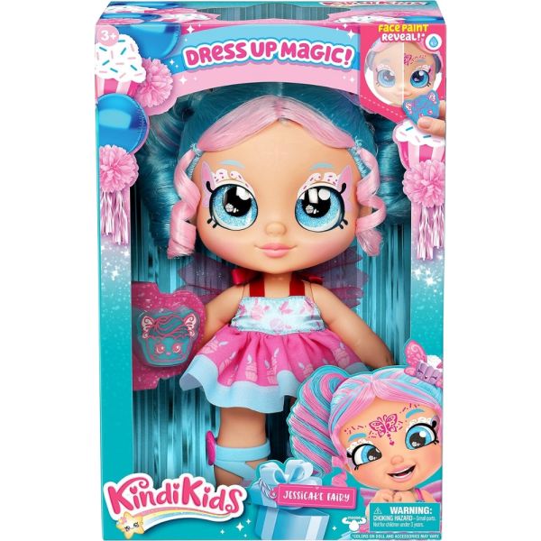 Muñeca Kindi Kids 50243-C Dress Up Magic Jessicake Fairy es la opción perfecta para las niñas a partir de los 3 años. Posee un hermoso vestido de hada de cupcakes y moño y unos pequeños zapatos que complementan el look. Viene con una esponja Shopkin especial de cupcake, que, al ser sumergida en agua helada y pasada por la frente de Jessi, revela un diseño exclusivo. Con unos ojos grandes y brillantes, cabello colorido que combina con su atuendo y ropas intercambiables, proporciona horas de diversión, y también ayuda a desarrollar la creatividad y la imaginación de las pequeñas.