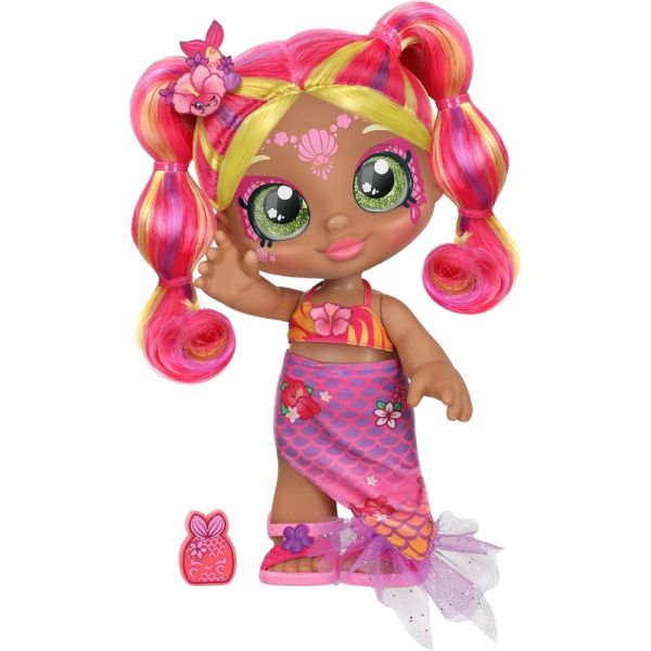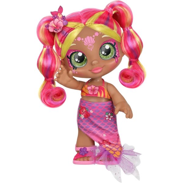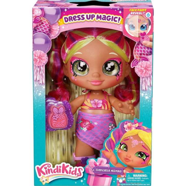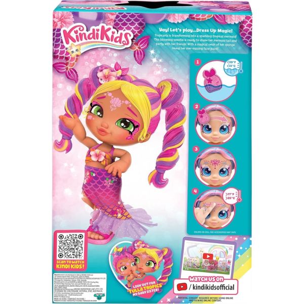 Muñeca Kindi Kids 50245 Dress Up Magic Tropi Carla Sirena es la opción perfecta para las niñas a partir de los 3 años. Posee un hermoso top floral, un brillante vestido de cola de sirena con un moño floral y unas pequeñas sandalias que completan el look. Viene con una esponja Shopkin especial de piña, que, al ser sumergida en agua helada y pasada por la frente de Carla, revela un diseño exclusivo. Con unos ojos grandes y brillantes, cabello colorido que combina con su atuendo y ropas intercambiables, proporciona horas de diversión, y también ayuda a desarrollar la creatividad y la imaginación de las pequeñas.