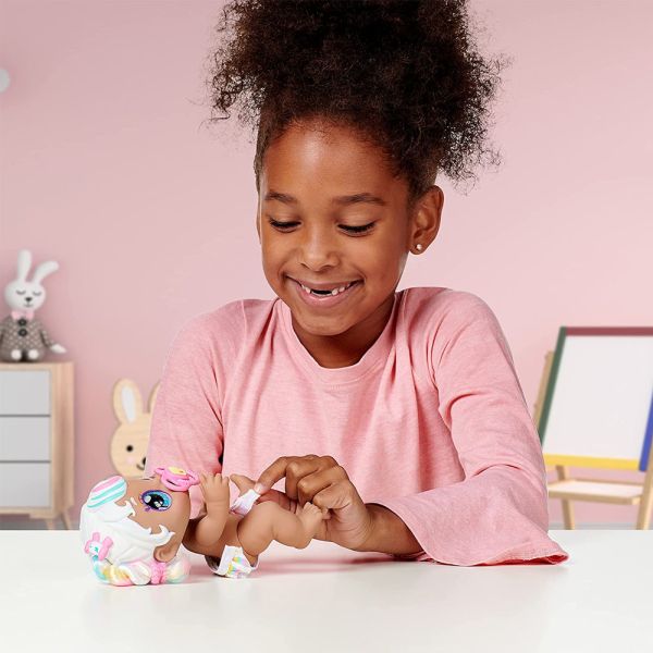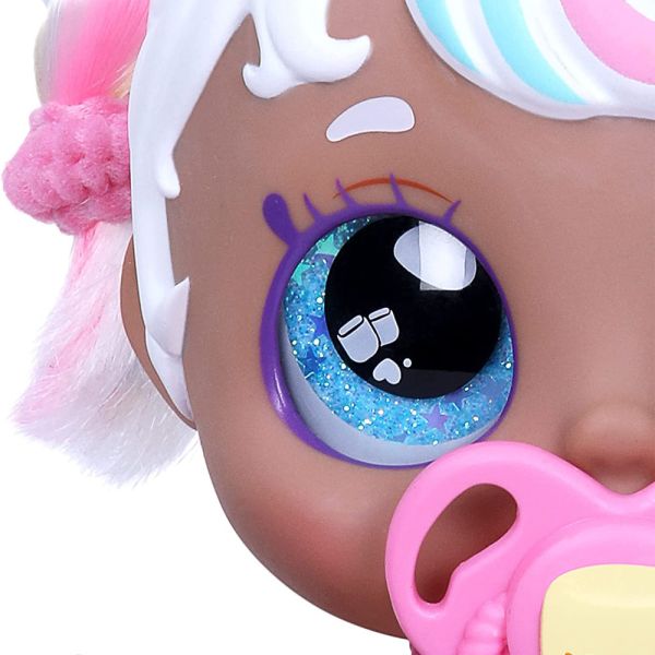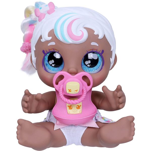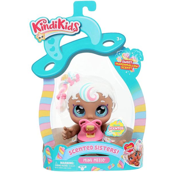 La Muñeca Kindi Kids está llena de diversión y juegos, Aprieta la barriga de Mini Mello y te lanzará un beso con aroma a flor de fresa. Al igual que las Kindi más grandes, tiene grandes ojos brillantes. ¡No podrás dejar de apretar sus brazos y piernas regordetes y blandos mientras su cabezita se balancea como un bebé de verdad! Esta hermanita perfumada tiene un pañal, un chupete y un babero removibles para un juego más divertido.
