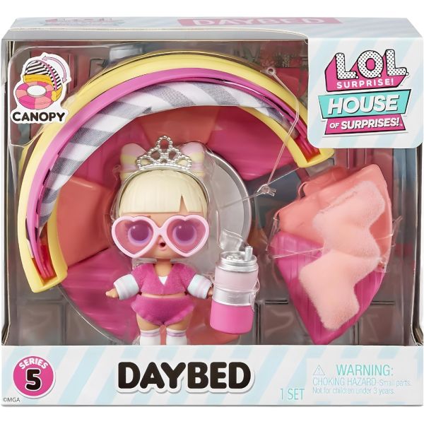 Muñeca L.O.L. Surprise! House Of Surprises Daybed con 8 sorpresas, incluyendo una muñeca exclusiva, un sofá cama con 2 almohadones de asiento y un toldo, una mesa, una almohada, un outfit y una botella. Es un conjunto hecho especialmente para añadir diversión y creatividad a la experiencia de juego.
