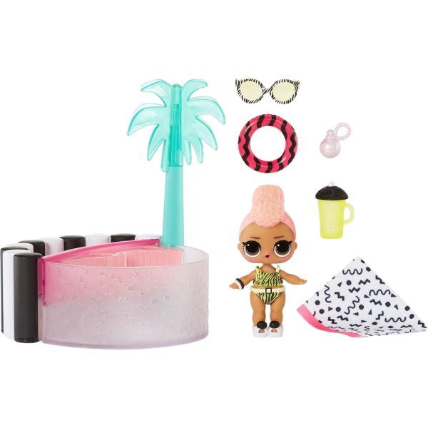Muñeca L.O.L. Surprise! House Of Surprises Hot Tub con 8 sorpresas, incluyendo una muñeca exclusiva, una bañera de hidromasaje, una palma desmontable, una toalla de playa, un tubo salvavidas, protector solar, un atuendo y una botella. Es un conjunto hecho especialmente para añadir diversión y creatividad a la experiencia de juego.