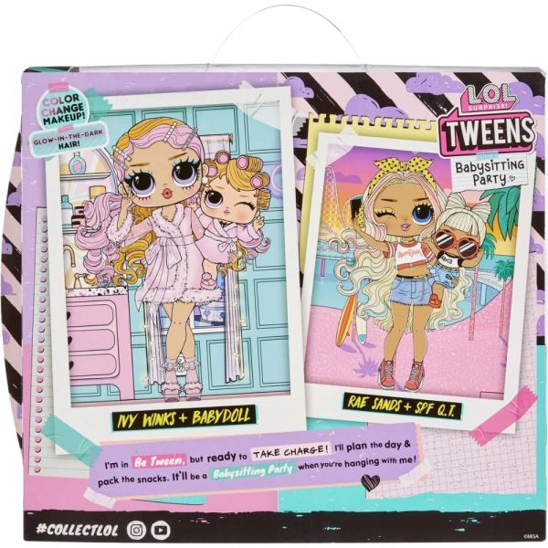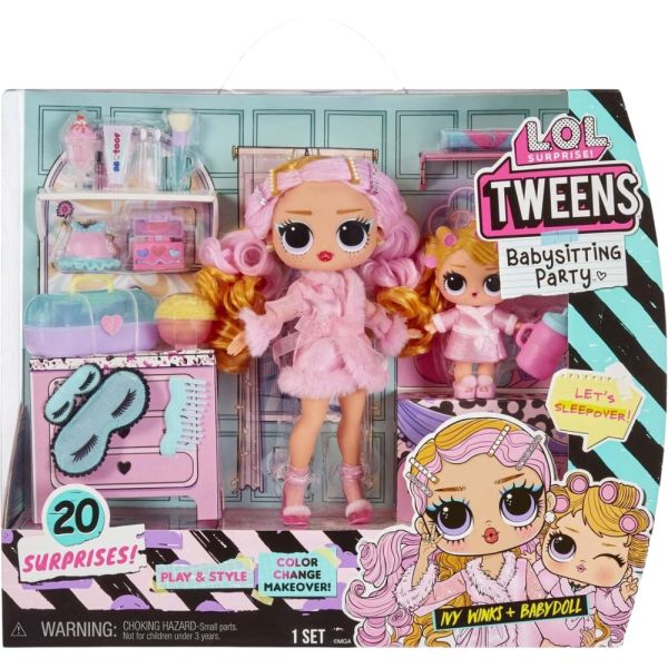 La Muñeca L.O.L Surprise Tweens + Hermanita Pijamada, es un set que contiene 20 sorpresas que incluyen una muñeca Tween (Ivy Winks) y una muñeca LOL (Babydoll). Ivy Winks tiene rasgos deslumbrantes, cabello hermoso y viene articulada para diferentes poses. Además, Ivy tiene múltiples sorpresas de cambios de color. Puedes sumergir la brocha de maquillaje de esponja en agua fría y pasarla por los ojos y los labios para ver qué se revela. Incluso hay una sorpresa que brilla en la oscuridad que se revela cuando llevas la muñeca Tween a una habitación oscura. Es el regalo perfecto para niñas de 3 años en adelante.