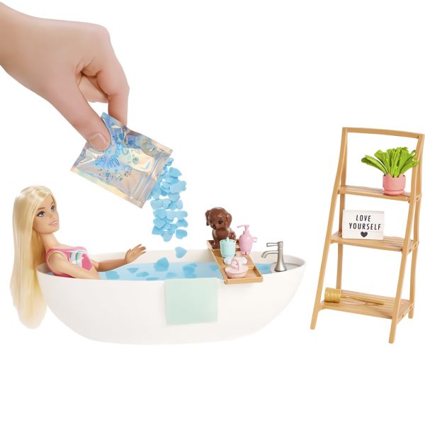 Este juego de Barbie es una forma divertida y colorida de disfrutar de un relajante tiempo de baño imaginativo. La muñeca es flexible y posable, con 7 puntos de articulación que le permiten moverse de manera realista. Viene con cabello rubio lacio y un traje de baño complementado con un pareo transparente, lista para sumergirse en la diversión. El set incluye dos bolsas de jabón de confeti en colores rosa y azul que cambian el agua del baño al mismo color. Estas bolsas son resellables, por lo que se pueden guardar para futuras sesiones de juego.Además de la muñeca, el set incluye una bañera, una bandeja de baño, una estantería, una toalla, un cepillo grande y uno pequeño, una botella de loción, un jabón, una planta, una vela, un letrero y un cachorro. Estos accesorios variados ayudan a crear diferentes escenarios para una narración imaginativa y añaden realismo al juego. La estantería y la bandeja de baño están diseñadas para enchufarse fácilmente, lo que las hace más resistentes y duraderas durante el juego.Observación:La muñeca no puede mantenerse en pie por sí sola. Los colores y la decoración pueden variar.