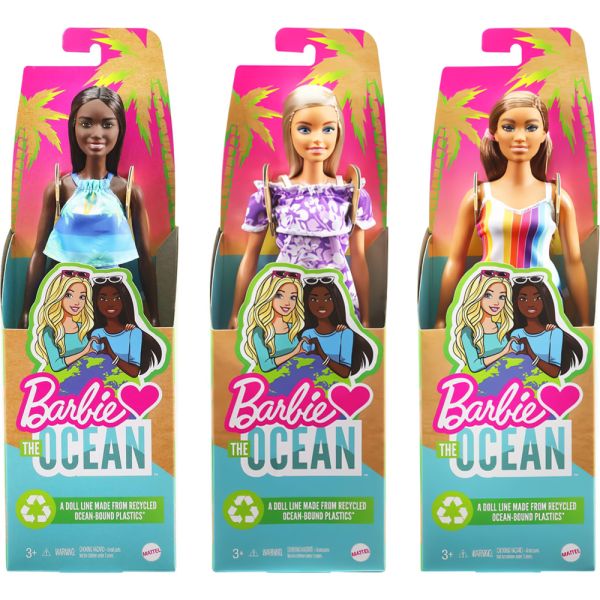 Barbie Loves the Ocean es una línea de muñecas sostenibles fabricadas con plástico reciclado y materiales reciclados para promover el cuidado del medio ambiente. Estas muñecas playeras tienen un estilo moderno y vienen con lentes de sol de plástico reciclado. Son el regalo ideal para niñas de 3 a 7 años, ya que además de proporcionar diversión, pueden imaginar sus propias aventuras con Barbie.Observación:Este producto viene desde el fabricante en forma de un surtido variado de modelos y/o colores (sin selección posible). Los colores y las decoraciones pueden variar.