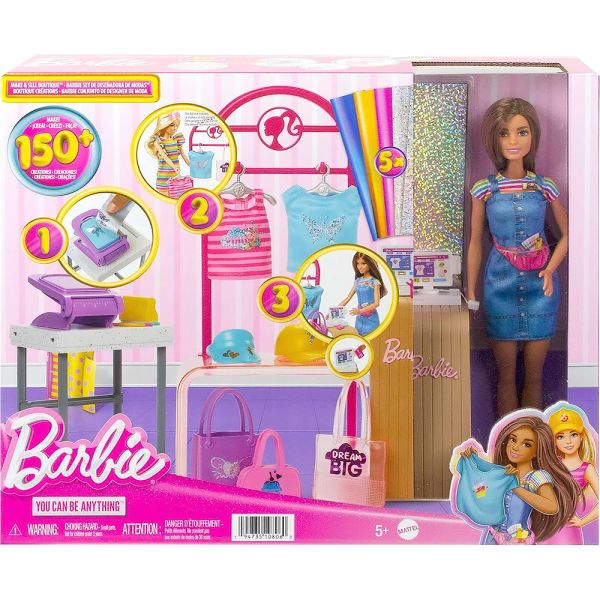 El set de juego Make & Sell Boutique ofrece a las niñas un estudio de diseño y fabricación único, donde pueden explorar su creatividad y estilo al crear más de 150 looks originales para la muñeca Barbie. Recomendado para niñas a partir de 3 años que adoran la moda y el diseño.El proceso es sencillo y divertido:Las niñas pueden seleccionar una moda de la colección, colocarla en la "impresora" y agregar una pegatina. Luego, eligen una hoja de aluminio y la colocan sobre la moda. Usando la herramienta de frotamiento, pasan por encima del área del diseño tres veces, revelando así un fabuloso diseño personalizado.Las calcomanías se pueden despegar para ser reutilizadas de diferentes maneras, lo que permite a las niñas experimentar con diferentes combinaciones y estilos.El juego incluye 2 blusas, 2 sombreros y 3 carteras, junto con 3 hojas de calcomanías que presentan imágenes icónicas, así como 5 hojas de aluminio, incluyendo 2 patrones brillantes.Para darle vida a la experiencia de juego, hay un estante de exhibición donde se pueden colgar los productos diseñados y estar listos para que los clientes los compren.Además, el juego cuenta con una caja registradora con un lector de tarjetas de crédito realista, brindando a las niñas una auténtica experiencia de boutique.Observación:La muñeca no puede mantenerse en pie por sí sola. Los colores y la decoración pueden variar.
