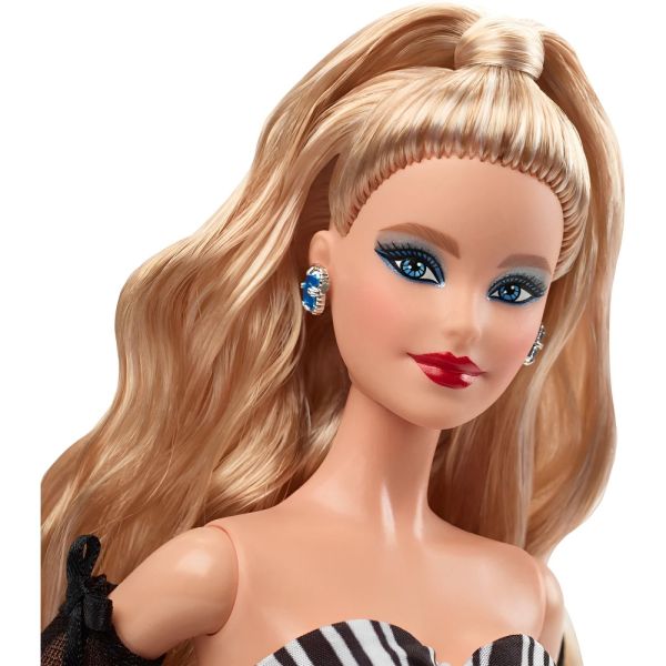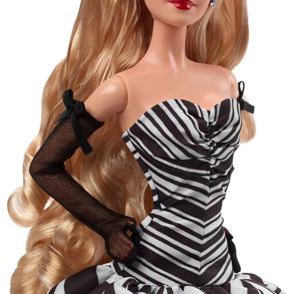 La Muñeca Mattel Barbie Signature 65th Anniversary HRM58 es la celebración perfecta para conmemorar 65 años de estilo y elegancia. Esta edición de colección captura la esencia de la muñeca Barbie original de 1959, presentando un look conmemorativo que encantará a todos los coleccionistas y amantes de la moda. El vestido blanco y negro, acentuado con toques de zafiro, refleja el estilo clásico que ha definido a Barbie por generaciones. Los detalles cuidadosamente seleccionados, como sus lentes de sol chic, la sombra de ojos azul y los labios rojos, añaden un toque moderno a su atuendo nostálgico. Los elegantes guantes negros largos completan este look icónico. Perfecta para exhibir, la Muñeca Barbie Signature viene con un soporte. Los fanáticos de Barbie encontrarán en esta muñeca una adición valiosa a su colección, o un regalo inolvidable para ocasiones especiales.