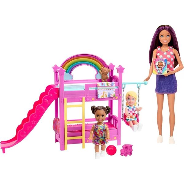 La Muñeca Mattel Barbie Skipper First Jobs Día de Cuidado (HND18) es el regalo perfecto para estimular la imaginación y creatividad de las niñas a partir de los 3 años. Este fascinante set de juego, inspirado en la emocionante película "Skipper y su gran aventura como niñera", permite explorar el mundo laboral con la hermana adolescente de Barbie, Skipper, como protagonista. El set incluye más de 15 accesorios temáticos que transforman cualquier espacio en una guardería de ensueño. Entre las divertidas actividades, las niñas pueden pintar en el caballete, disfrutar de una taza de té en la mesa, montar un espectáculo inolvidable de marionetas, columpiarse, deslizarse y luego descansar en las acogedoras literas. Los muebles y accesorios variados permiten una experiencia de juego versátil, ideal para horas de entretenimiento educativo.