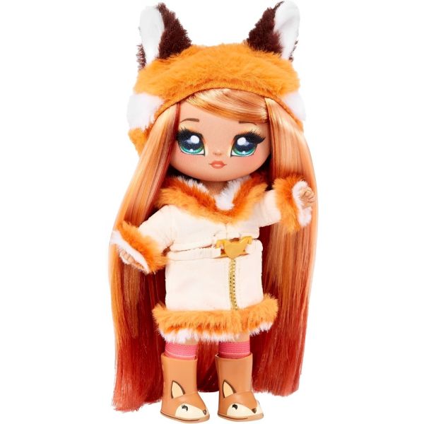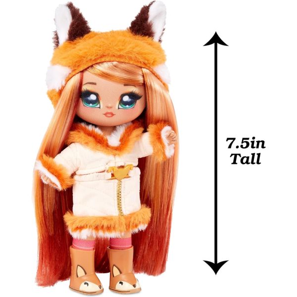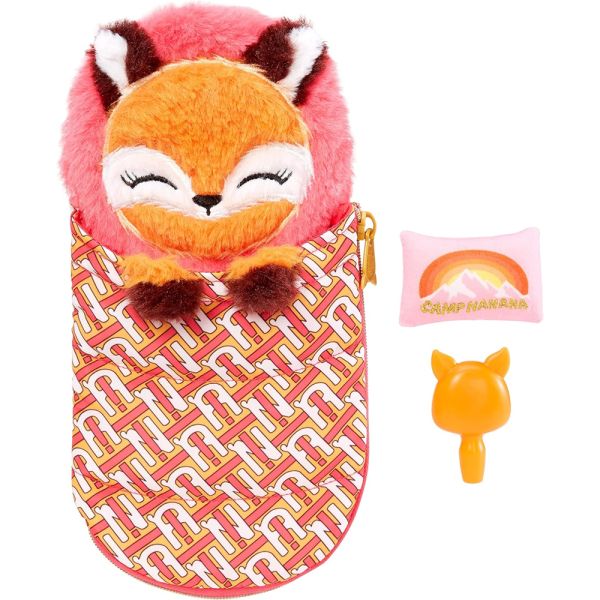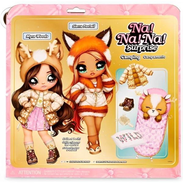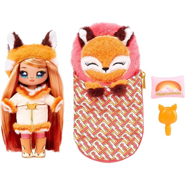 La Muñeca Na! Na! Na!Surprise Camping Sierra Foxtail de 19 cm es perfecta para explorar el aire libre con estilo. Esta muñeca de campamento 2 en 1 incluye una bolsa de dormir con temática animal. Sierra Foxtail tiene un largo cabello naranja inspirado en un zorro, y viene con cara impresa y detalles de ropa. Sus hermosas modas inspiradas en zorros incluyen una acogedora chaqueta blanca con cuello y mangas de pelo, y una falda blanca con hebilla de cinturón y cremallera. Es suave para abrazos y posable para jugar. Además, incluye una acogedora bolsa de dormir de felpa con temática animal y cremallera funcional, completando el conjunto ideal para cualquier aventura al aire libre.