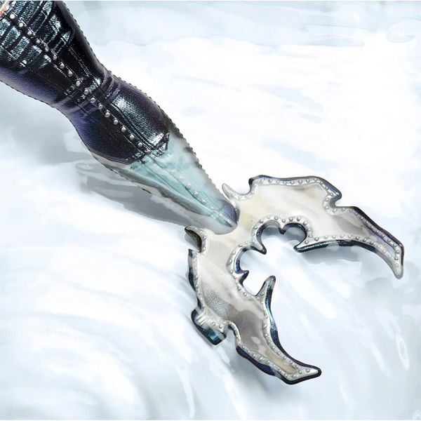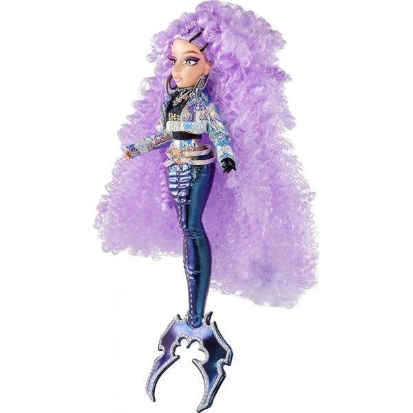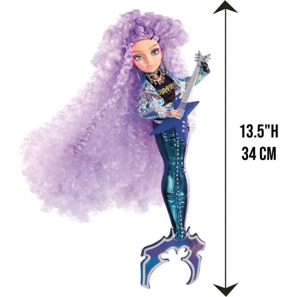 La muñeca Sirena Mermaze Mermaidz Color Change Riviera, de 34 cm, ofrece una experiencia mágica con su cola esculpida que cambia de color. Cuando se sumerge en agua tibia, su cola pasa de un azul oscuro a un verde azulado, y revela destellos plateados al contacto con agua fría. Además, su cola también funciona como soporte cuando la aleta se dobla 90 grados, permitiéndole sostenerse por sí misma. Con puntos de articulación en el cuello, hombros, codos, muñecas, torso, cintura y aletas, esta sirena puede adoptar numerosas poses. Su hermoso cabello morado rizado, ojos de cristal y pestañas reales, junto con su maquillaje de fantasía con toques morados y pecas brillantes, la hacen deslumbrante. Viste una reluciente camiseta de la banda MRMD, una chaqueta de piel sintética iridiscente con detalles de púas, un cinturón de arnés iridiscente, y accesorios como aretes, dos collares y una guitarra eléctrica violeta, completando su look único y fascinante.