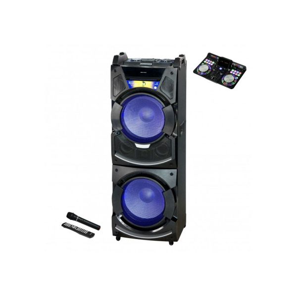 El Parlante Mega Star SPA1566DJ con diseño práctico y moderno, con entradas USB, SD y auxiliar, control remoto y 1 micrófono. Además, cuenta con grabador, ecualizador, luces LED dinámicas y Fader.