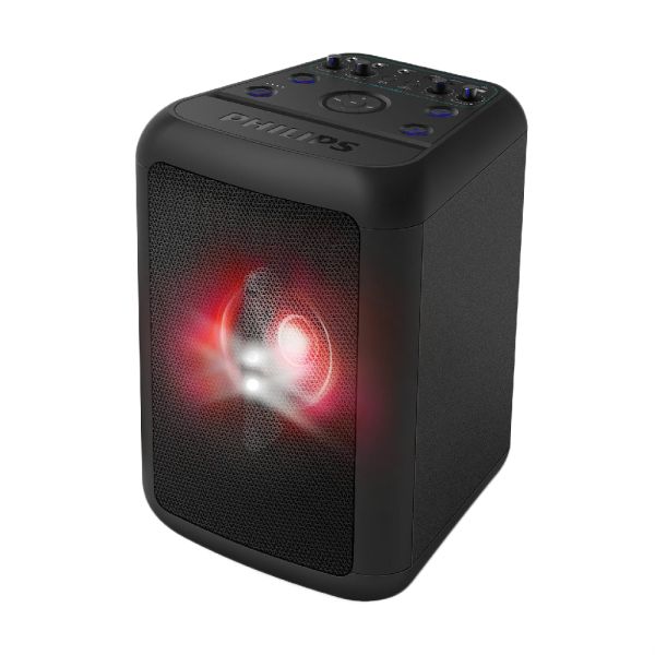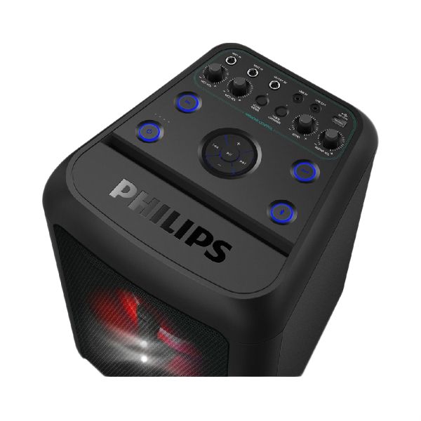 Parlante Philips Party TANX100/10 obtendrás sistema de audio todo en uno, con reproducción de audio de alta resolución con tecnología inalámbrica bluetooth incorporada. Podés disfrutar de 14 horas de tiempo de reproducción, además de funciones de karaoke, efectos de luces y entrada para guitarra.