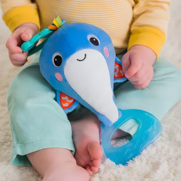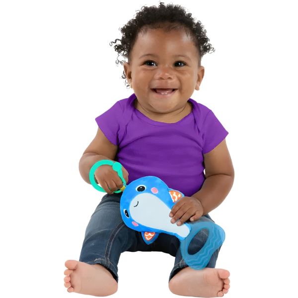 El peluche colgante Bright Starts Whale-a-roo, con un diseño divertido y colorido, está diseñado para estimular los sentidos de la vista, oído y tacto del bebé. Fabricado con un 80% de tela y un 20% de plástico, es ideal para bebés de 0 meses en adelante. Con dimensiones de 35 x 14 x 10 cm, este juguete presenta una ballena llamada Playtime que ofrece una experiencia sensorial única. Al tirar de la cola de la ballena, se activan vibraciones, mientras que agitarla produce divertidos sonidos, proporcionando al bebé un emocionante juego de causa y efecto. El peluche cuenta con cintas de colores brillantes y texturas crujientes y arrugadas para explorar, fomentando las habilidades motoras finas del bebé. Además, el juguete se puede acoplar fácilmente a la mayoría de los transportadores, lo que lo convierte en una opción ideal para llevar durante los viajes. Esta ballena de peluche no solo es entretenida, sino también educativa, ya que contribuye al desarrollo sensorial y motor del bebé. Además, su fácil limpieza hace que sea conveniente mantenerlo en condiciones higiénicas. Una opción perfecta para ofrecer diversión y estimulación a los más pequeños.
