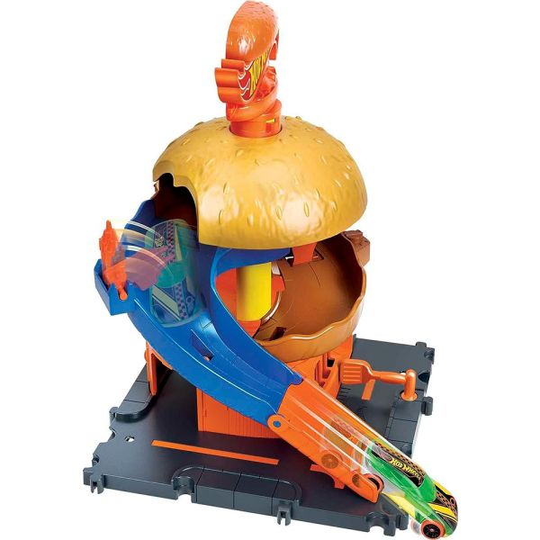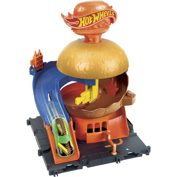 En la tienda de hamburguesas de Hot Wheels City, los niños pueden simular llevar y disfrutar deliciosas comidas. Con tan solo girar el cartel del logotipo, los vehículos Hot Wheels cobran vida y atraviesan el autoservicio en una divertida simulación. Cada detalle ingenioso del lugar mejora la inmersión en el juego, garantizando una experiencia llena de diversión y creatividad. Los niños pueden ejercer su imaginación mientras revisan el emocionante menú y operan la compuerta móvil con forma de espátula para dar paso a los veloces vehículos.El set incluye un vehículo Hot Wheels, lo que permite que la diversión comience de inmediato. Es el regalo ideal para niños a partir de 4 años, ya que les permite imaginar emocionantes aventuras o recrear divertidas historias.Observación:Los colores y las decoraciones pueden variar.