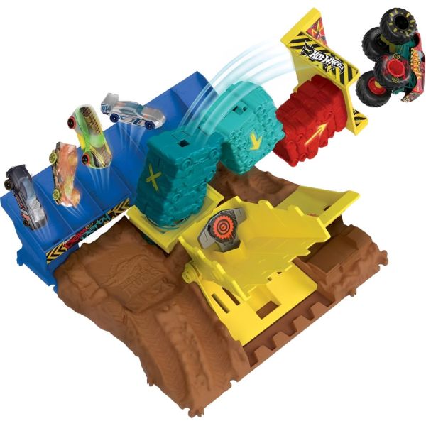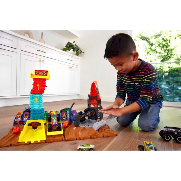 Contiene: 1 conjunto de juego de semifinales Hot Wheels Monster Trucks Arena Smashers, 1 camión Monster Truck de Hot Wheels a escala 1:64, 2 coches aplastables